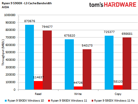 Tom'sHardware navíc zjistil, že i po patchích pro Windows 11 je zápis do L3 cache Ryzenů stále výrazně pomalejší než ve Windows 10 (a čtení i kopírování jsou rovněž pomalejší, byť je rozdíl nižší). Latence se sice srovnaly, přenosová rychlost ale stále není v plné kondici: