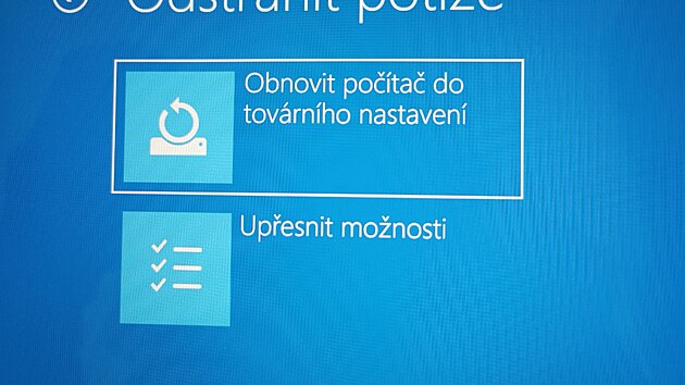 Konečně se dostáváme k nejvýkonnější nabídce. Jak již její název napovídá, slouží k odstranění potíží s PC. Mělo by to být jedno z míst, do kterého byste měli zamířit, pokud se setkáte s problémy s Windows. Obsahuje širokou škálu nástrojů, které se zobrazí, pokud na ni kliknete myší. Respektive se nejprve zobrazí dvě podnabídky – Obnovit počítač do továrního nastavení a Upřesnit možnosti.