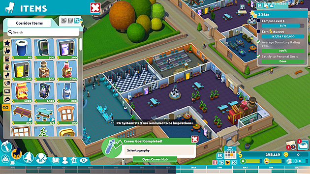 Všude po budově rozmísťujete lavičky, jídelní automaty, květiny, obrazy a podobně. Studenti vám sami čas od času řeknou, co by si přáli, ovšem ne vždy jim můžete vyhovět. Přesto se to vyplatí, protože bez bonusových zkušeností, odměn za inspekce a podobně bych v některých momentech zbankrotoval.